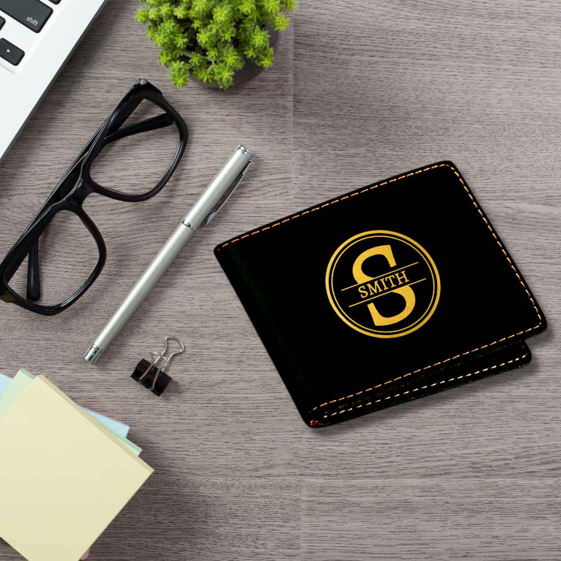 A cool, classy and personalized wallet with name, perfect as a gift for men. It has 6 card slots and 2 currency note compartments, made with high quality faux leather.
