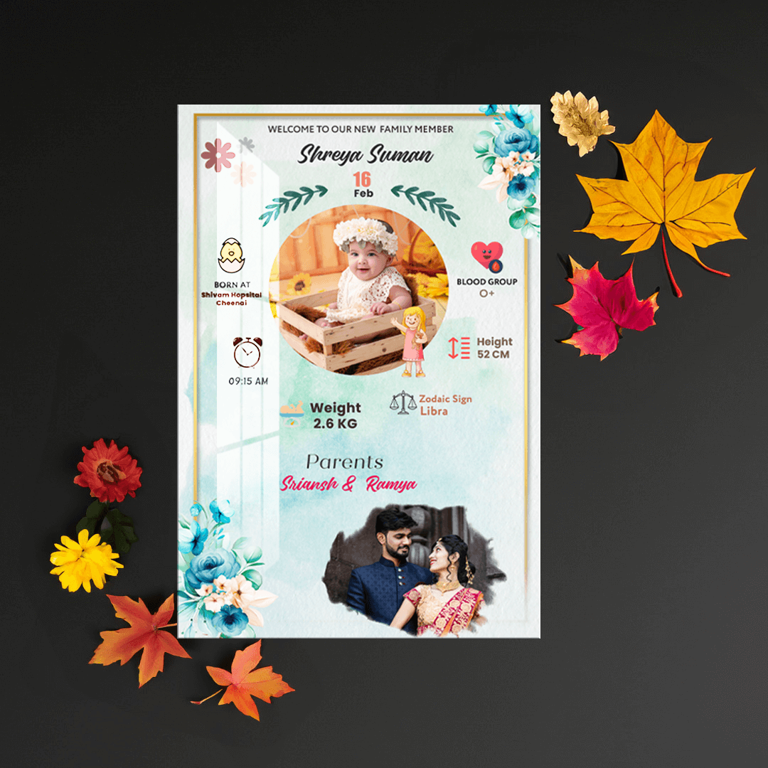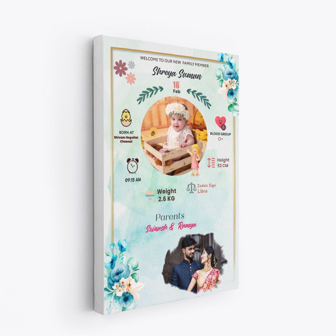 A personalized baby frame for new born babies with options to add name, nickname, birth date, time, place, weight, blood group, and height. Available in different sizes and frame options.