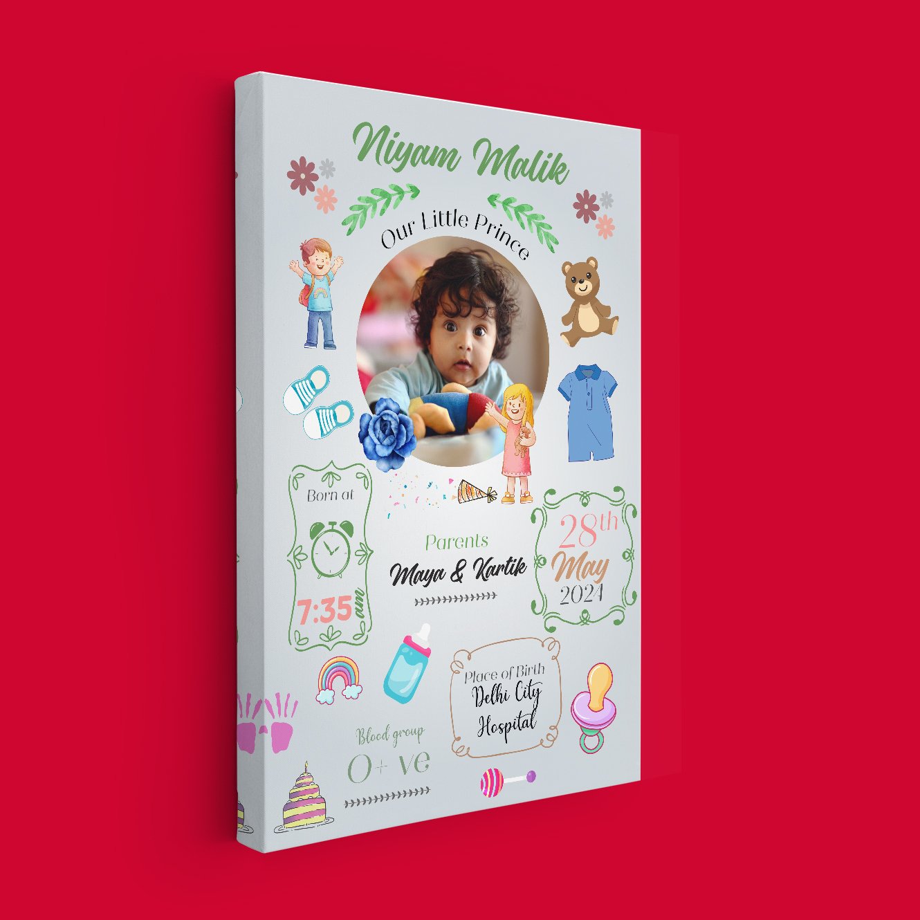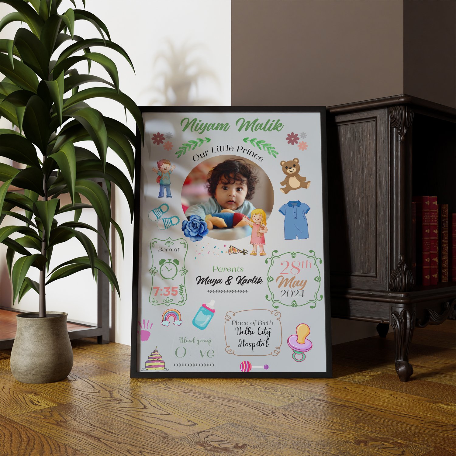 A personalized baby frame that allows you to add your newborn’s bio details, including name, birth date, time, place, weight, blood group, and height. Choose from various frame options and sizes.