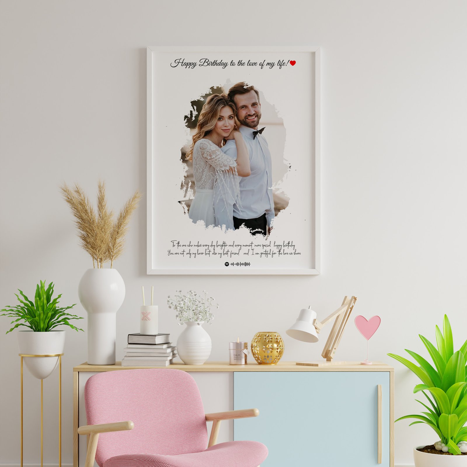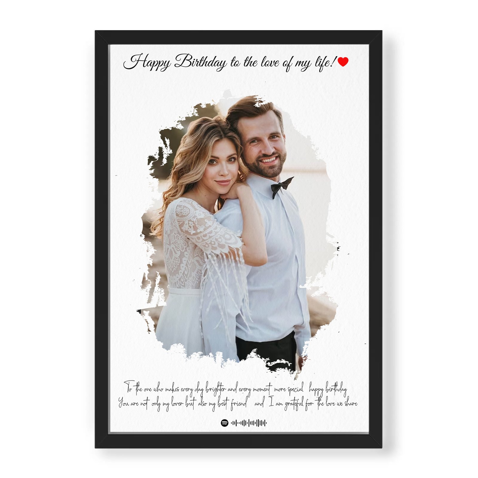 A personalized art frame with a customizable message for Spotify fans. Choose from various sizes and frame options to make it a unique gift.